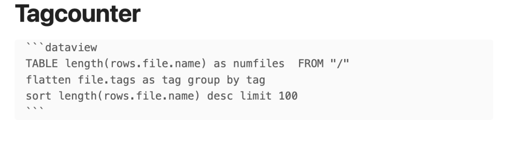 - Once each note had been created and tagged a codebook for each of the question or topic areas could be generated using the dataview plugin and the simple query shown below.