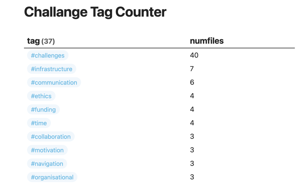 - The Obsidian graph view and dataview queries combine to give various views on the data to support the next steps of thematic coding. Here the codes are shown in green and the notes in grey. Challenges as the unifying element is obviously the strongest but we can also see the predominance of other nodes and the connections formed.