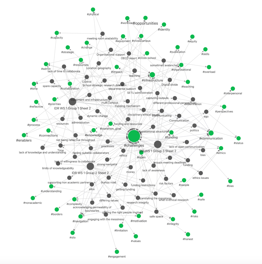 This work looks at taking those raw sheets and coding them in Obsidian and processing them through D4.js to produce a range of tables, codebooks and visual representations useful in the qualitative analysis of this workshop activity.