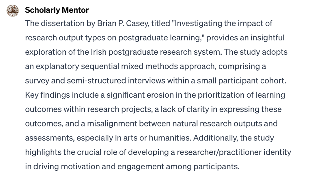 Let’s bring the AI further into the project. Could a custom GPT provide an impartial critique of work? In times when emotions are getting a bit frayed in a project and the supervisor relationship getting a bit strained could an impartial AI view on the work provide a much needed firebreak or even mediate between two positions. Also much like the self critique could the GPT provide a first pass reading of drafts to reduce supervision burden.